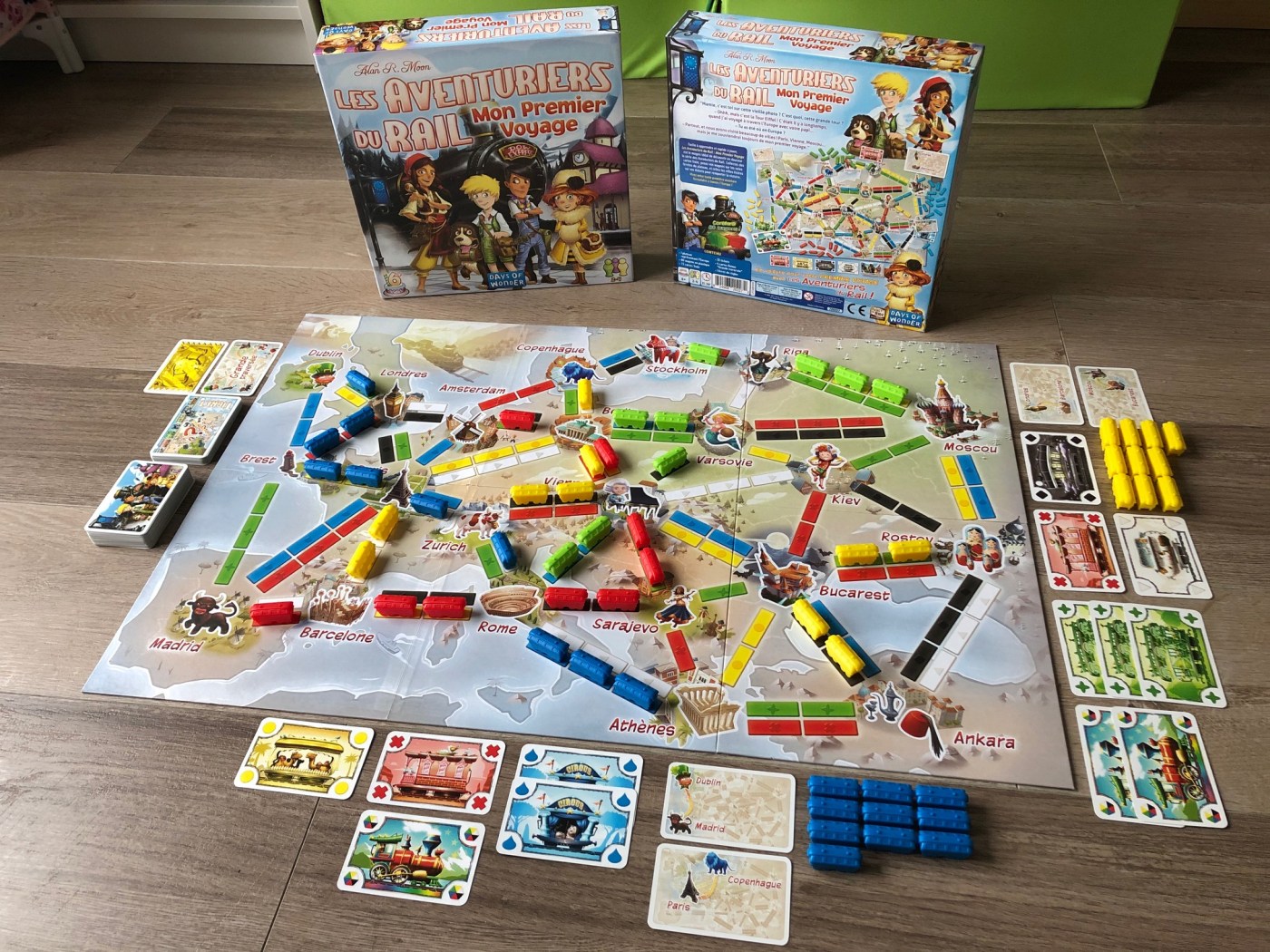 Et pour ne rien gâcher, le jeu est magnifique ! Les cartes sont belles et colorées, à la fois les wagons et les cartes destinations, le grand plateau est superbe et très bien pensé, de taille agréable et bien lisible, les pièces de wagons sont également faciles à manipuler, le tout respire la qualité et on apprécie bien là le travail d’Asmodée. Une très belle mouture pour un jeu de société devenu incontournable dans toute ludothèque junior digne de ce nom !